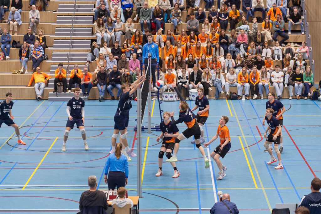 Bij de foto: Olhaco in actie tegen Nederlands kampioen Keistad. Van links naar rechts bij Olhaco (rechts van het net): Aron Zantingh, Stefan Koster, Noël van der Sleen, Bjorn Bakker, Joris Weulink en Jan Kemkes.